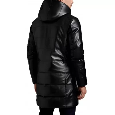 Manteau doudoune avec capuche cuir agneau homme fermeture par zip et pressions cuir ovin haut de gamme (agneau waxy),. Vous pouvez sans supplément avoir ce manteau dans d'autres longueurs. Doublure satin noir. Rembourrage molleton mais possibilité d'avoir le garnissage en duvet d'oie sur devis.