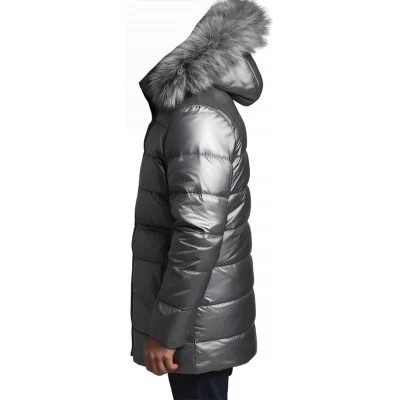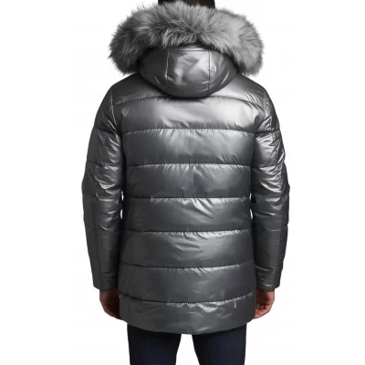 Doudoune homme à capuche agneau métal gris capuche bords renard véritable gris argenté modèle Cosmoce