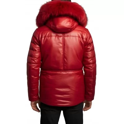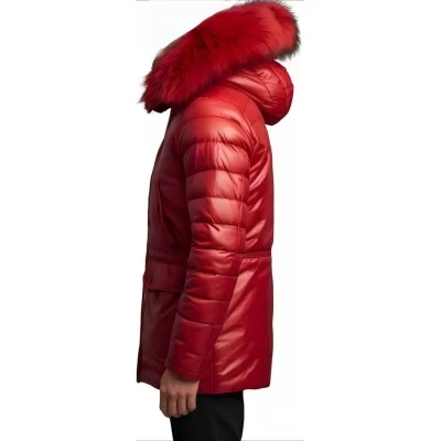 Superbe doudoune en cuir d'agneau rouge avec capuche bords renard rouge véritable. Cette doudoune est fabriquée en cuir d'ovin agneau fleur corrigé semi aniline cuir haut de gamme et renard d'élevage peausserie de luxe. Doublure satin. Cette doudoune est rembourrée avec un garnissage synthétique mais sur devis nous pouvons la garnir avec du duvet d'oie ou de canard. Existe en d'autres couleurs.