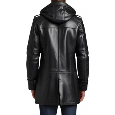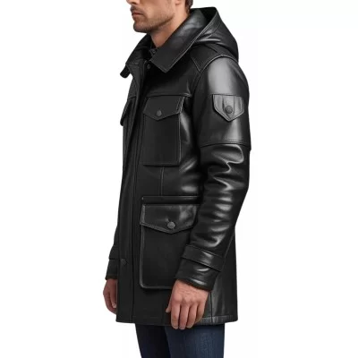 Trois quart en cuir homme type veste de combat en agneau noir avec capuche amovible. Ce trois quart est fabriqué en cuir d'agneau fleur corrigé cuir haut de gamme. Doublure satin. N'hésitez pas à faire fabriquer ce trois quart sur mesure afin d'avoir un vêtement éxactement à vos mensurations.