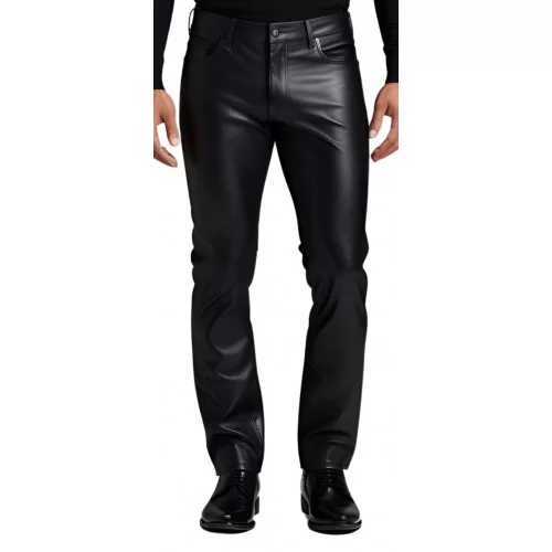 Pantalon fashion en cuir stretch homme en agneau noir avec deux bandes en cuir blanc sur chacun de ses côtés. Choisissez la fabrication sur mesure...