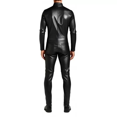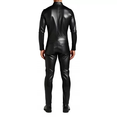 Combinaison homme en agneau noir stretch coupe  près du corps, fermeture par zip. Choisissez la fabrication sur mesure pour cette combinaison cela vous permettra d'avoir un vêtement à vos mensurations exactes. Grâce à cette prestation haut de gamme offerte, cette combinaison épousera parfaitement les formes de votre corps. Elle est fabriquée en cuir ovin agneau semi-aniline cuir très haut de gamme.
