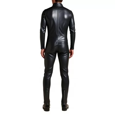 Combinaison homme en agneau noir stretch près du corps fermeture par zip. Choisissez la fabrication sur mesure pour cette combinaison cela vous permettra d'avoir un vêtement à vos mensurations exactes. Grâce à cette prestation haut de gamme offerte, cette combinaison épousera parfaitement les formes de votre corps. Elle est fabriquée en cuir ovin agneau semi-aniline cuir très haut de gamme.