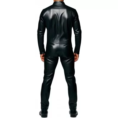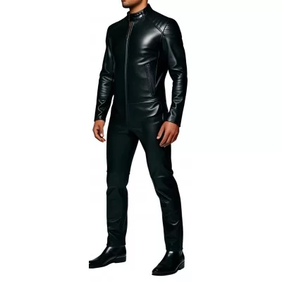 Combinaison homme en agneau noir stretch très près du corps fermeture par zip.  Choisissez la fabrication sur mesure pour cette combinaison cela vous permettra d'avoir un vêtement à vos mensurations exactes. Grâce à cette prestation haut de gamme offerte, cette combinaison épousera parfaitement les formes de votre corps. Elle est fabriquée en cuir ovin agneau semi aniline cuir très haut de gamme.