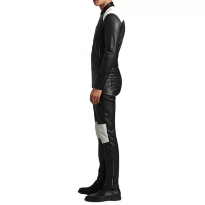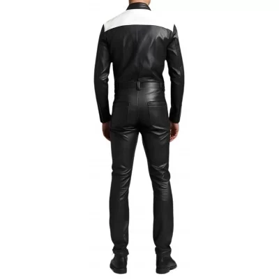 Combinaison fashion homme en agneau noir et blanc stretch près du corps fermeture par zip. Choisissez la fabrication sur mesure pour cette combinaison cela vous permettra d'avoir un vêtement à vos mensurations exactes. Grâce à cette prestation haut de gamme offerte, cette combinaison épousera  parfaitement les formes de votre corps. Elle est fabriquée en cuir ovin agneau semi-aniline cuir très haut de gamme.