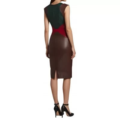 Robe mi longue en cuir d'agneau de trois couleurs marron vert et rouge sans manches modèle Cirnaly