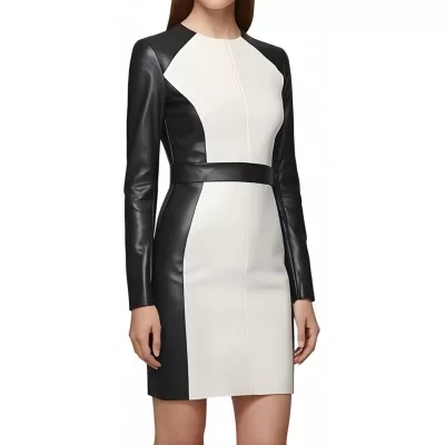 Robe mi courte en cuir d'agneau de deux couleurs noir et blanc manches longues modèle Abrikal