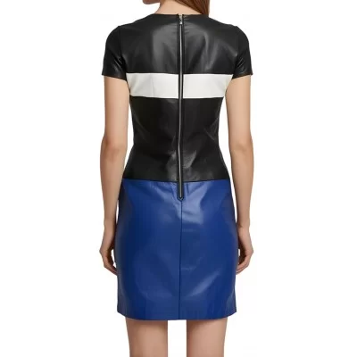 Robe mi longue en cuir d'agneau de trois couleurs noir blanc et bleu sans manches modèle Pirisse