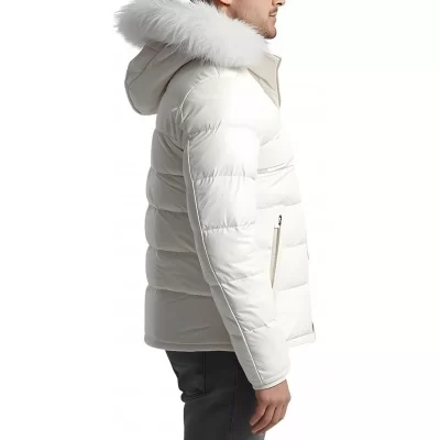 Doudoune homme en cuir d'agneau blanc capuche avec bords renard blanc modèle Amia