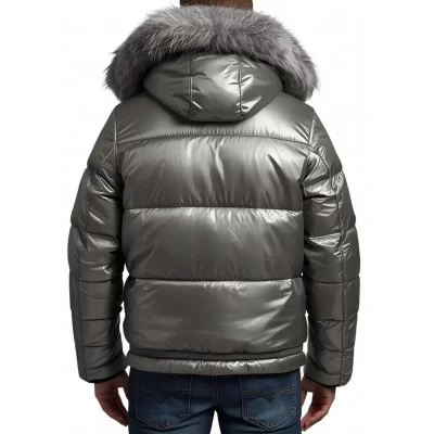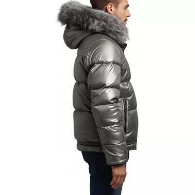 Doudoune homme en cuir gris métal avec sa capuche avec bords renard argenté. Vous aimerez son look intemporel et fashion. N'hésitez pas à user d'imagination et choisissez une couleur différente en agneau classique et cela sans supplément. Cette doudoune est confectionné en cuir ovin agneau fleur corrigé semi-aniline. Cette doudoune est doublée en molleton épais mais vous pouvez l'avoir en garnissage duvet d'oie ou canard nous demander.