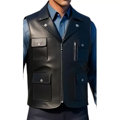 Gilet en cuir type reporteur en vachette noire fleur corrigé semi-aniline cuir haut de gamme. Fermeture par zip en métal sur le devant du gilet et zip sur son dos. Vous pouvez sans supplément avoir ce gilet dans d'autres longueurs ou avec des changements option personnalisation offerte. Doublure satin.