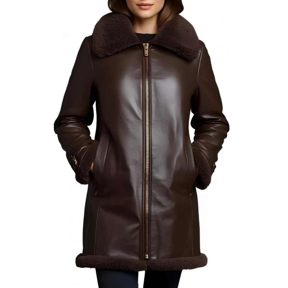 Veste trois quart femme en mouton retourné marron finition huilé poils courts à l'intèrieur modèle Lassy