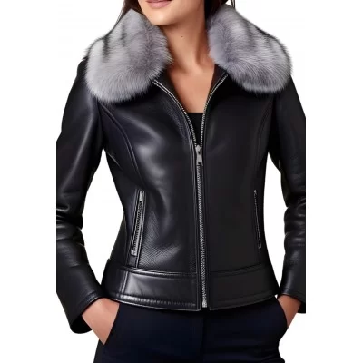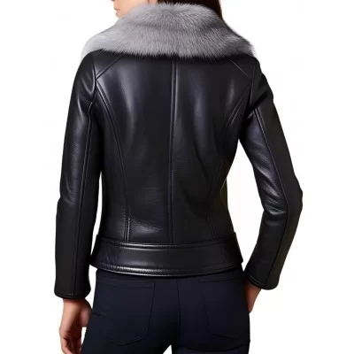 Blouson peau lainée mouton mérinos extèrieur aspect cuir huilé noir col renard argenté amovible modèle Bony