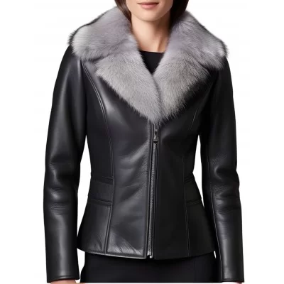 Blouson peau lainée mouton mérinos extèrieur aspect cuir huilé noir col renard argenté amovible modèle Cirly