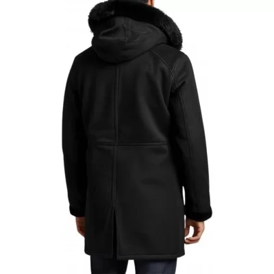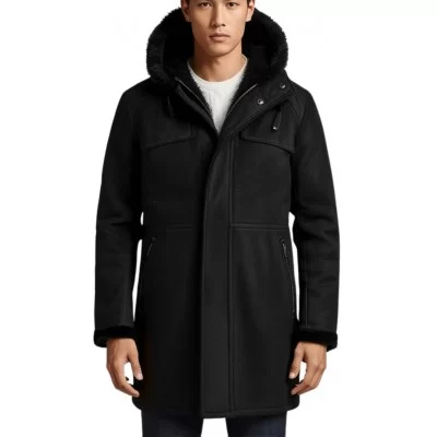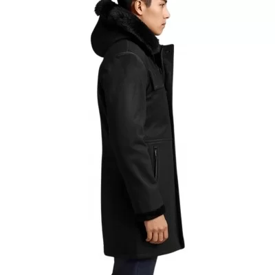 Trois quart en peau lainée finition peau velours noir avec capuche ( possibilité d'avoir cette capuche amovible). Cuir ovin mouton fleur corrigée semi-aniline extèrieur finition façon cuir, poils courts intèrieur, cuir haut de gamme (mouton lainée). Vous pouvez sans supplément avoir ce trois quart en peau lainée dans d'autres longueurs. Possibilité d'avoir cette peau lainée en finition façon cuir huilé sans supplément de prix.