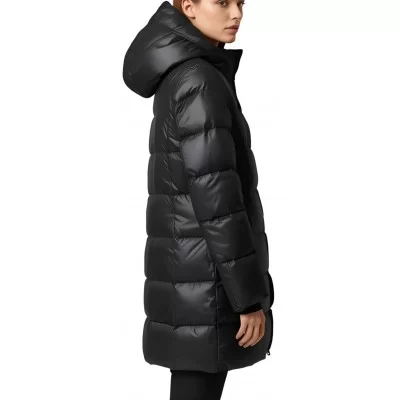 Doudoune trois quart femme en cuir d'agneau noir avec capuche amovible modèle Désirée