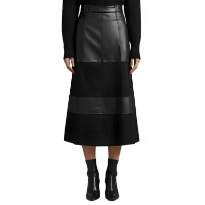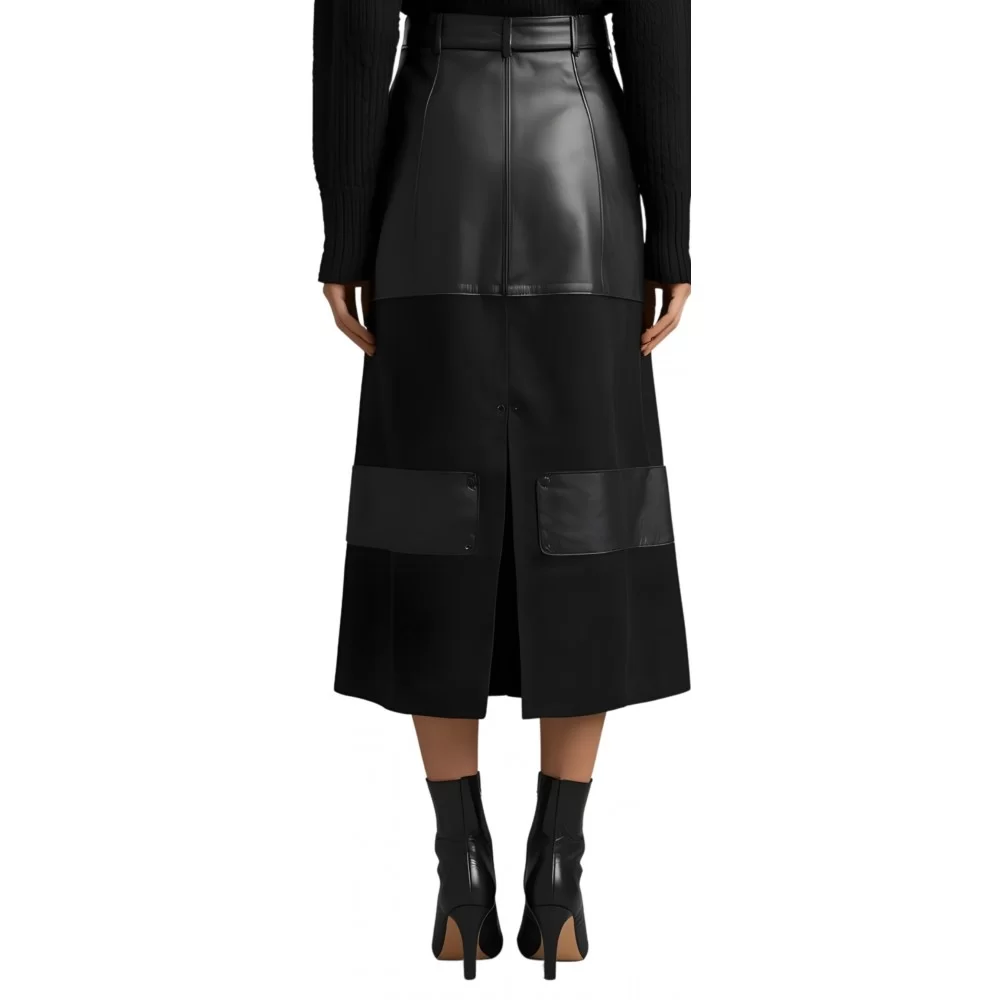 Jupe longue évasée en agneau noir et agneau velours noir modèle Nour
