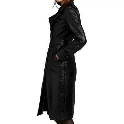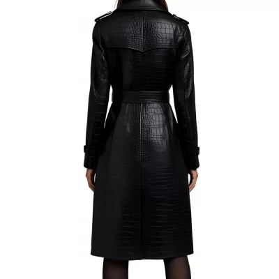 Trench manteau femme en cuir d'agneau impression crocodile noir ceinture cuir double boutonnage modèle Craola