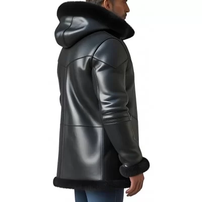 Veste fashion homme en mouton retourné finition huilé noir avec capuche ( possibilité sur simple demande de l'avoir amovible). Trois quart fermé par zip. Cuir ovin mouton fleur corrigée semi-aniline extèrieur finition façon cuir, poils courts intèrieur, cuir haut de gamme (mouton lainée). Vous pouvez sans supplément avoir ce trois quart en peau lainée dans d'autres longueurs. Possibilité d'avoir cette peau lainée en finition façon daim sans supplément de prix.