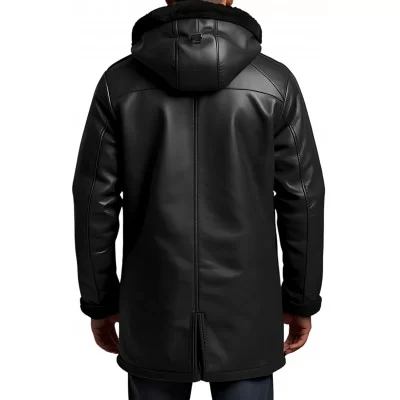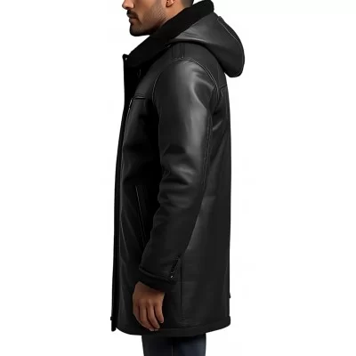 Trois quart homme extèrieur en mouton retourné façon cuir huilé intèrieur mouton noir avec capuche modèle Lucien