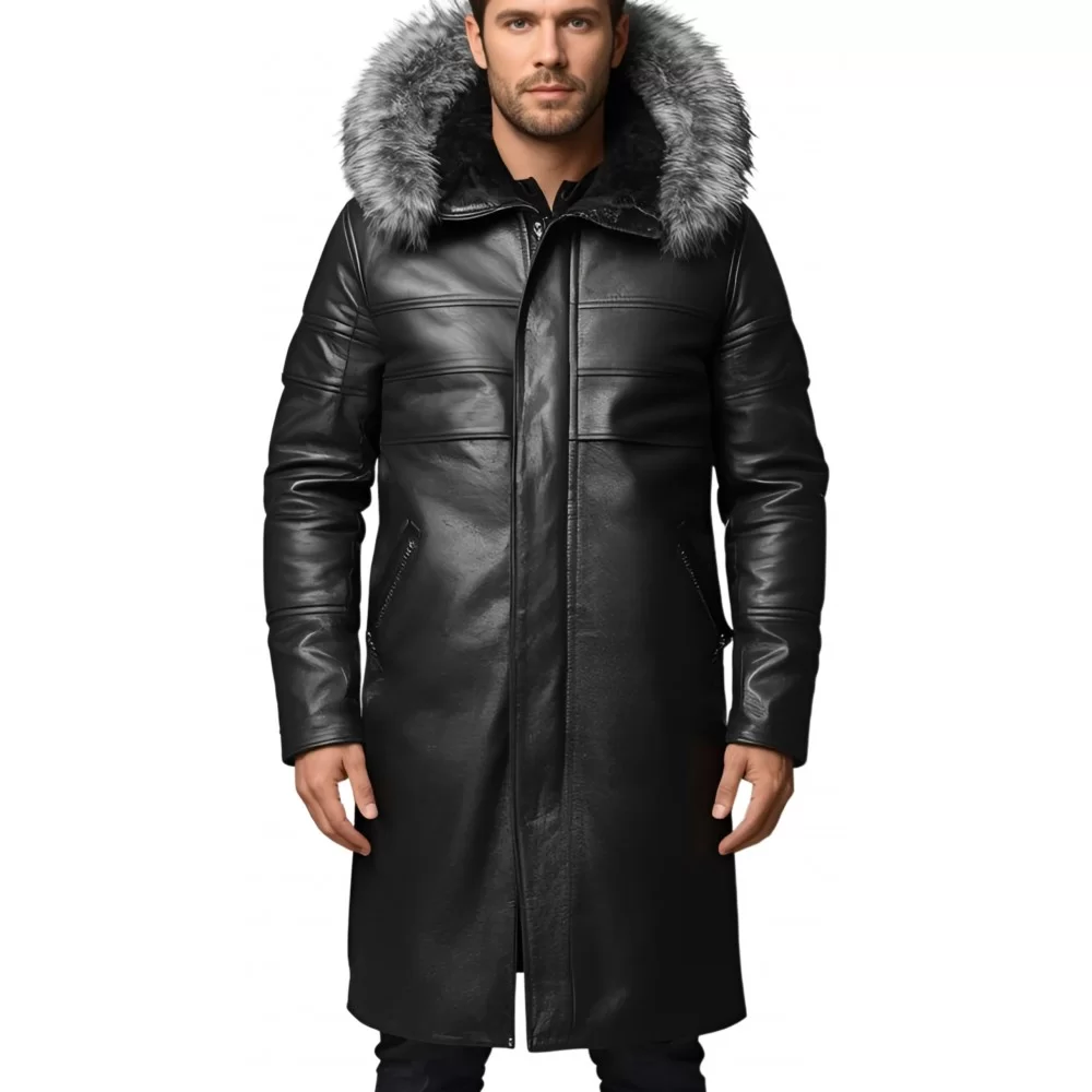 Trois quart homme peau lainée en mouton retourné finition huilé noir avec capuche ( possibilité sur simple demande de l'avoir amovible). Trois quart fermé par zip. Cuir ovin mouton fleur corrigée semi-aniline extèrieur finition façon cuir, poils courts intèrieur, cuir haut de gamme (mouton lainée). Vous pouvez sans supplément avoir ce trois quart en peau lainée dans d'autres longueurs. Possibilité d'avoir cette peau lainée en finition façon daim sans supplément de prix.