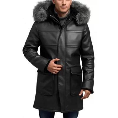 3/4 homme peau lainée mouton retourné huilé noir intèrieur mouton noir avec capuche amovible bords renard argenté modèle Lucio
